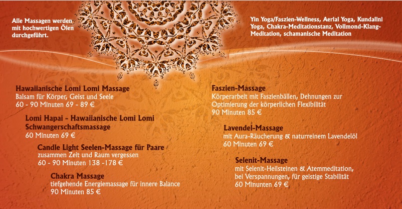 Mein Angebot erstreckt sich daher von sanfter bis energetisierend intensiver Hawaiianischer Lomi Lomi und vielen anderen Massagen wie TAO® Swing Faszien-Massage, Klangmassage, Chakra-Massage und bis hin zu Meditationen, Aerial Yoga, Yin Yoga, Kundalini Yoga, Heilmagnetismus, Meditations-Tanz.